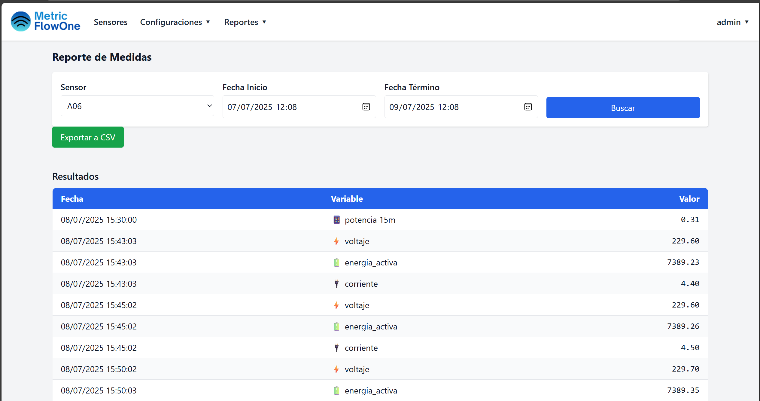 Filtra por sensor y rango de fechas, exporta datos crudos para conciliaciones y auditorías. |