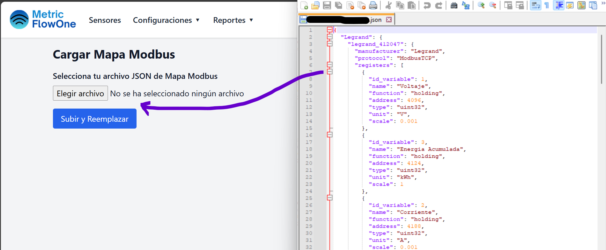 a) Carga masiva de medidores: importa configuraciones Modbus (ID, gateway, descripción, unidad, marca, modelo) en un solo paso.