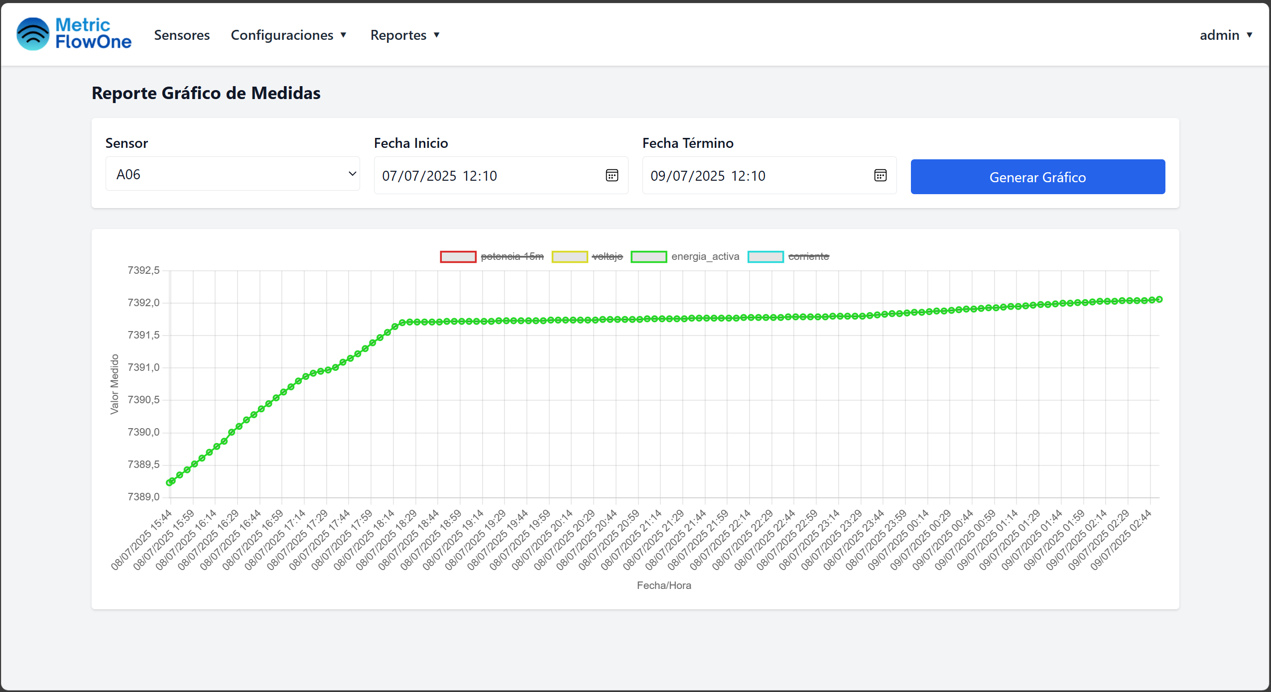 | Gráfico | Visualiza tendencias de energía activa, voltaje y corriente en línea temporal. |